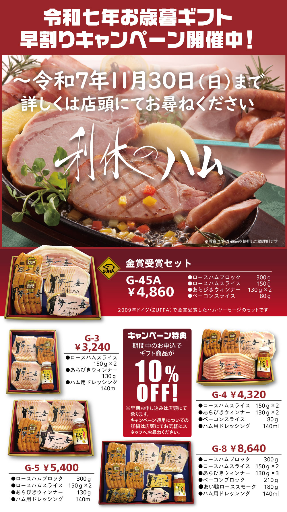 2025年11月1日 2025年【お歳暮ギフト】早割キャンペーン実施中! 夢一喜 貝塚工場で製造しています「利休のハム」をお歳暮の贈り物にいかがですか? 2025年11月30日(日)まで ギフト早割キャンペーンを実施しております。 早期ご注文で、お得なサービスを各店舗でご用意しております。 ギフトは、お電話、店頭からご注文いただけます。 ご不明な点は、各店舗へお電話または、店頭スタッフへお気軽にお問合せ下さい。